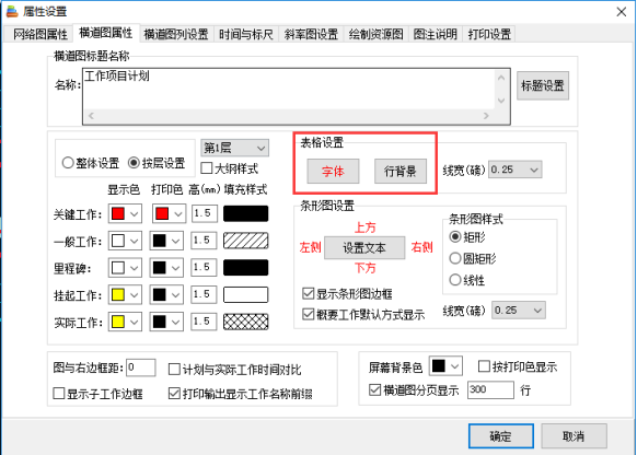 2. 横道图表格字体也可按层修改,首先选择横道条设置中的“按层设置”,再选择需要修改字体的工作层数,即可修改“表格设置”内字体类型及大小、“显示色”、“打印色”,