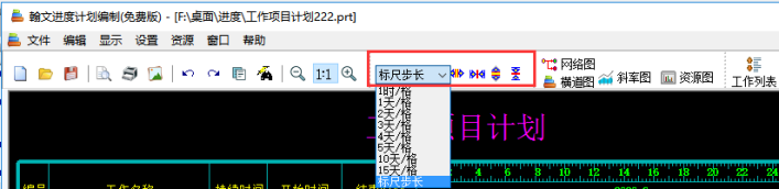 1.横道图中,如需时间标尺距离缩短显示或是伸长显示,可选择上方工具栏中的“标尺步长”,选择时间标尺按照1小时一格显示,1天一格显示,2天一格或5天一格显示等(如下图)。