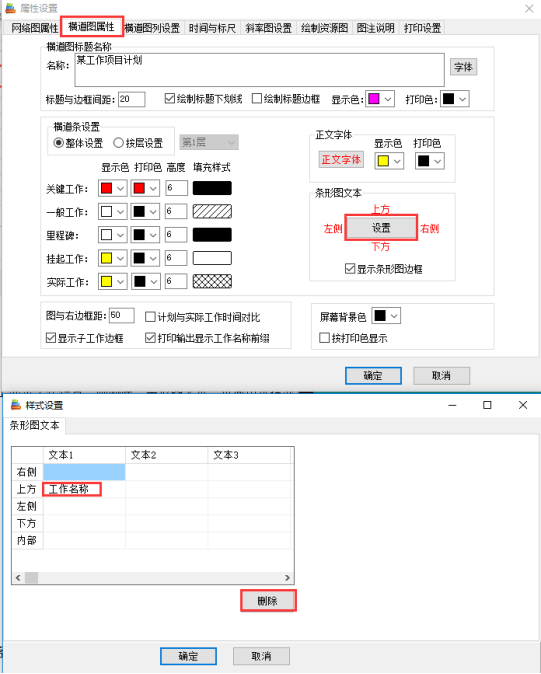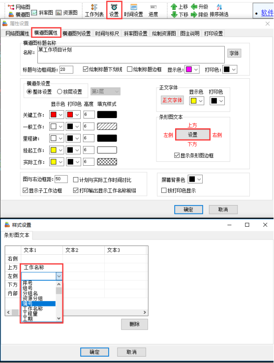 1.1. 点击上方工具栏的“设置”按钮,在弹出的对话框中选择“横道图属性”页面,设置“条形图文本”。在“右侧”,“上方”,“左侧”,“下方”所对应的框中选择需要显示的内容。