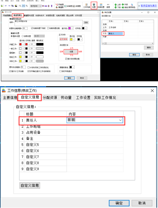 1.2. 如果选择显示的内容不是系统默认的,则需自己定义工作信息。如下图,在横道条下方选择显示“责任人”。