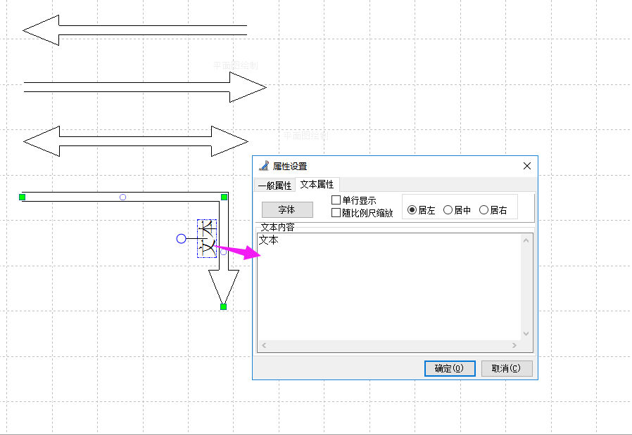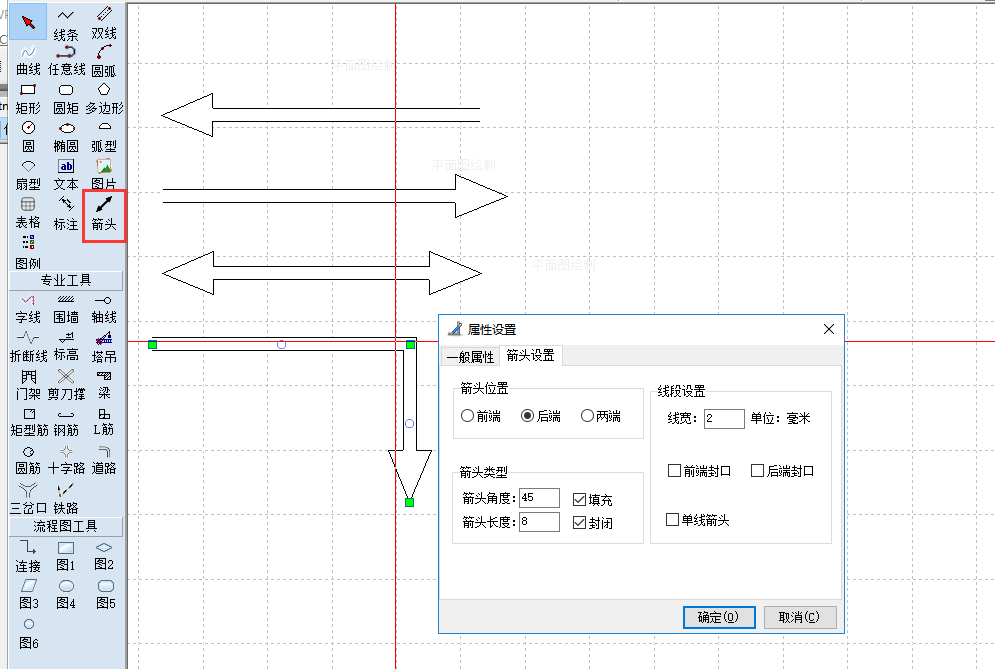 点击“箭头线”工具,在作图页面上画出箭头线,点击鼠标左键拖动鼠标,可输入箭头线的长度和角度(输入长度按回车键输入角度),点击回车或是点击鼠标左键结束。再单机鼠标右键,在属性设置中进行箭头设置,如下图,可选择箭头位置,线段位置,箭头类型等。